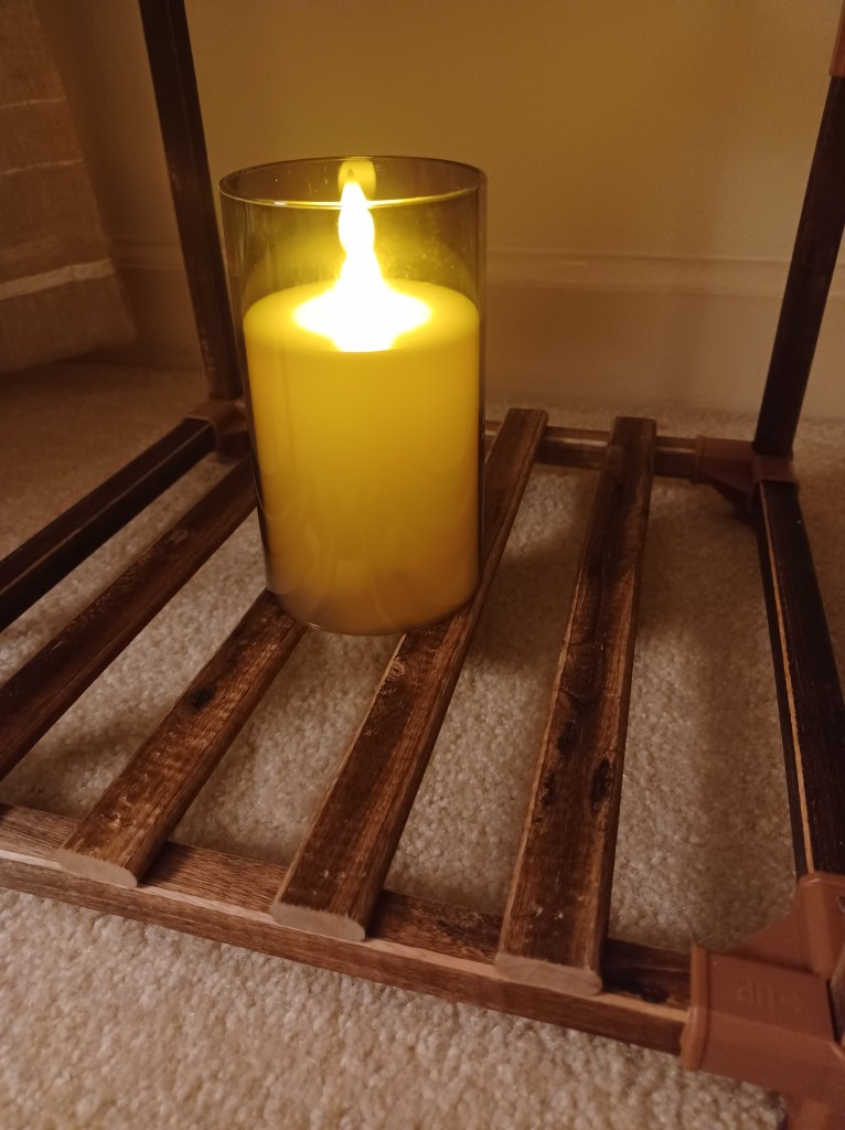 On a positive note, I bought a cute little battery operated lamp from Amazon that I’ve put in my bookcase. It’s really a lovely little light…would be a great nightlight in the bathroom or hallway. I just love battery operated lights. It just makes your space feel more cozy and makes me happy. This has a timer and so I love that feature because it will be on when I get home from work each night. Also got these 2 flameless candles that I put on my plant stand. See images below.